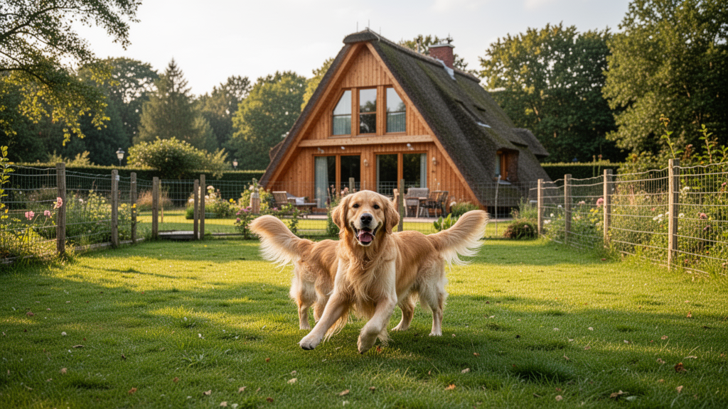 Unser Ferienhaus bietet mit seinem 1000m² großen, komplett eingezäunten Garten den idealen Freiraum für Ihren Vierbeiner. Hier kann Ihr Hund sicher toben, während Sie auf der Terrasse entspannen. Im Haus sind Hunde nicht nur geduldet, sondern herzlich willkommen.
