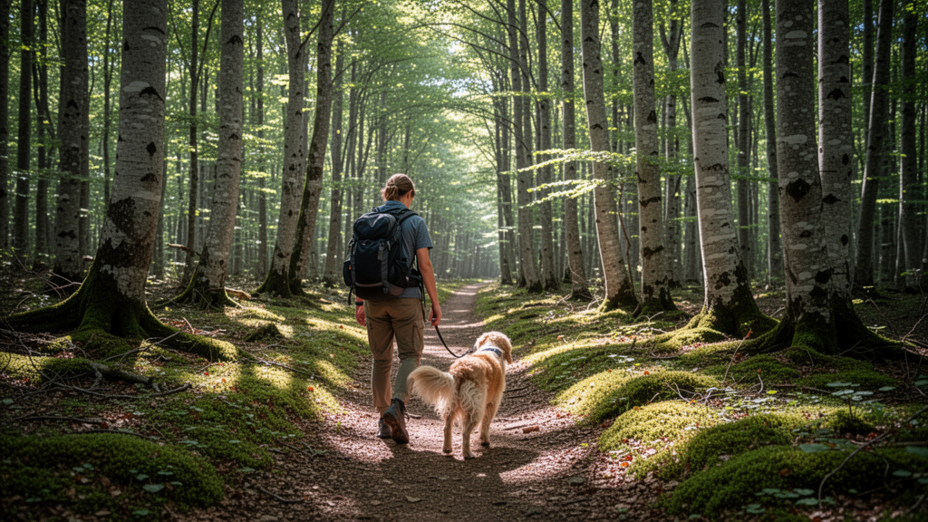 Damit Sie sicher unterwegs sind, empfehlen wir folgende Packliste: Ein gut sitzendes Brustgeschirr, eine flexible Schleppleine (ideal für Gebiete mit Leinenpflicht, um dem Hund dennoch Radius zu geben), ausreichend Wasser und ein faltbarer Trinknapf, Zeckenzange, kleine Snacks für zwischendurch sowie Kotbeutel. Ein kleines Hunde-Erste-Hilfe-Set mit Verbandsmaterial ist für längere Touren im Wald ebenfalls ratsam.